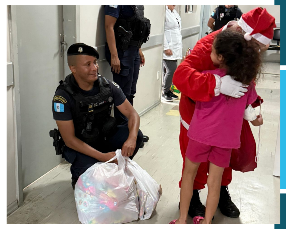 A primeira ação foi realizada pelo Projeto Social Filhos do Rei, sob a responsabilidade da professora Élen Borges, que levou música e a entrega de presentes, promovendo encantamento e o verdadeiro espírito natalino. Em seguida, a Patrulha Escolar da Guarda Municipal participou da atividade com a entrega de brinquedos arrecadados pelos próprios guardas municipais, contribuindo para arrancar sorrisos e fortalecer o vínculo com a comunidade.