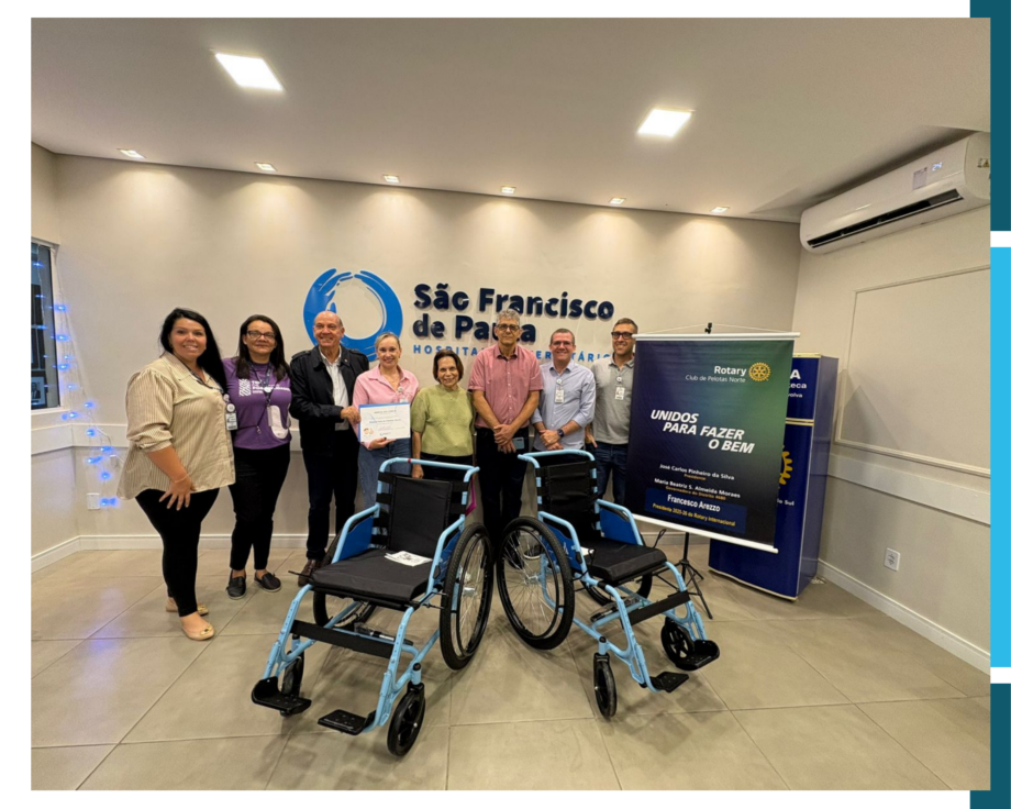 O Hospital Universitário São Francisco de Paula recebeu, nesta quarta-feira, representantes do Rotary Club Pelotas Norte para oficializar a entrega de duas cadeiras de rodas que serão utilizadas no atendimento aos pacientes da instituição. A iniciativa faz parte do programa Mobilidade para Todos, projeto que incentiva a inclusão e a acessibilidade por meio da oferta de equipamentos que facilitam a locomoção de pessoas em situação de vulnerabilidade.