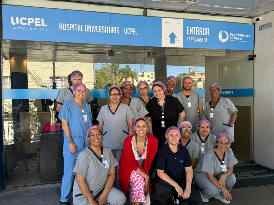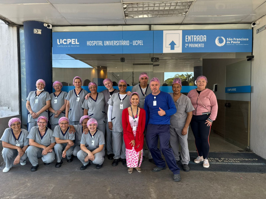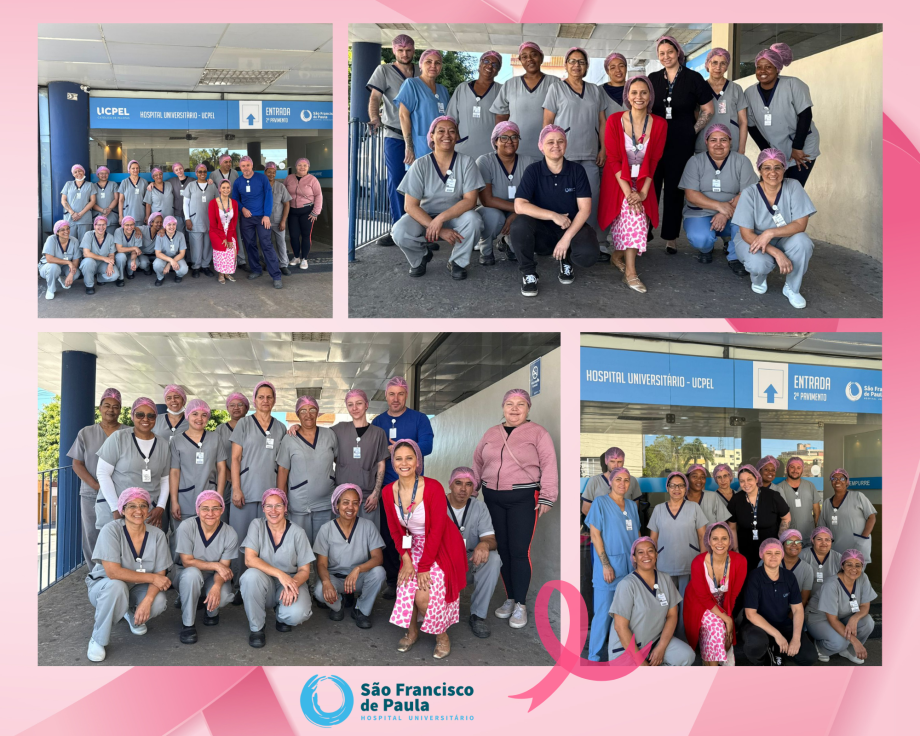 Em alusão ao Outubro Rosa, a equipe de limpeza do Hospital Universitário São Francisco de Paula (HUSFP) se uniu numa ação simbólica: todos os profissionais do setor da Limpeza e Higienização estão usando toucas cor de rosa ao longo deste mês, como gesto de apoio à luta contra o câncer de mama e de sensibilização sobre a importância do autocuidado e da prevenção.